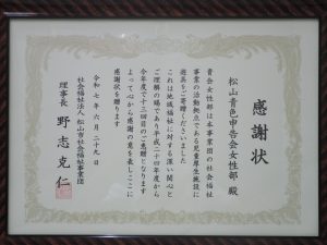 松山青色申告会女性部の部長と副部長がオープニングセレモニーの寄贈式に参加し感謝状をいただきました。